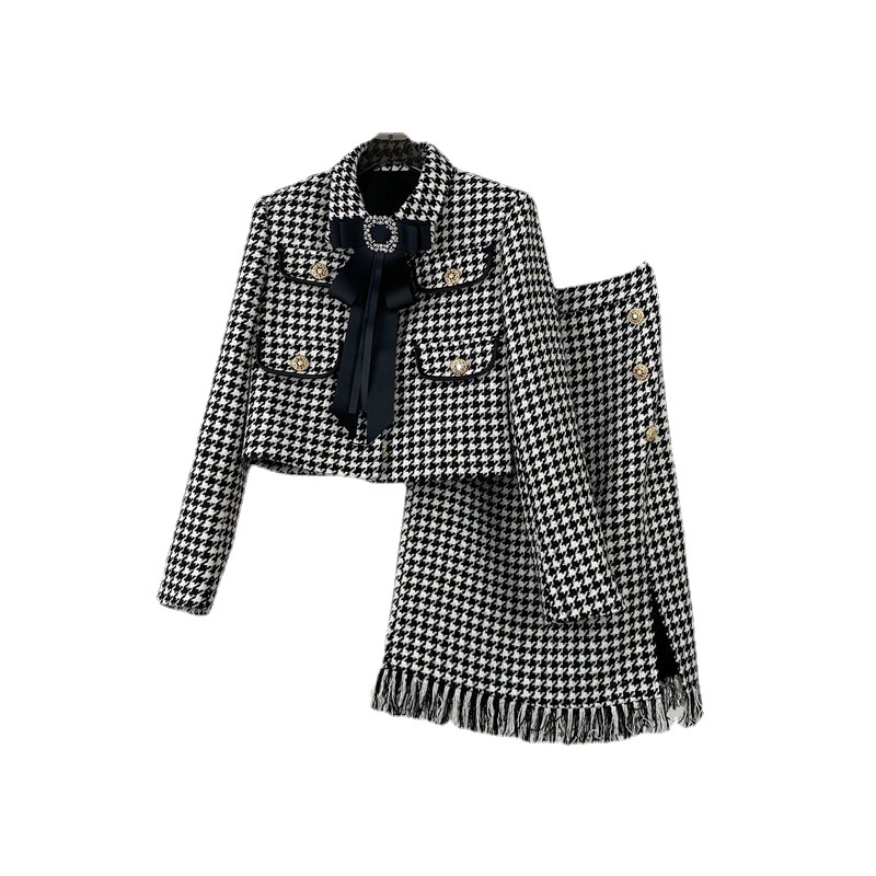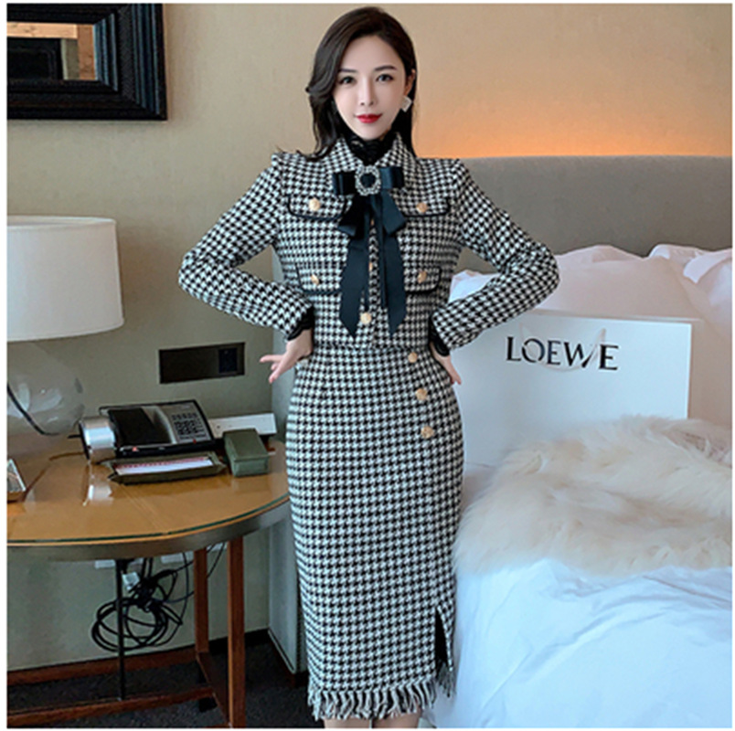 Product information: Supply category: Spot Style: Ladies Pattern: Houndstooth Style: skirt suit Top style: coat Top sleeve length: long sleeve Skirt length: mid-length skirt Craft: collage/splicing...